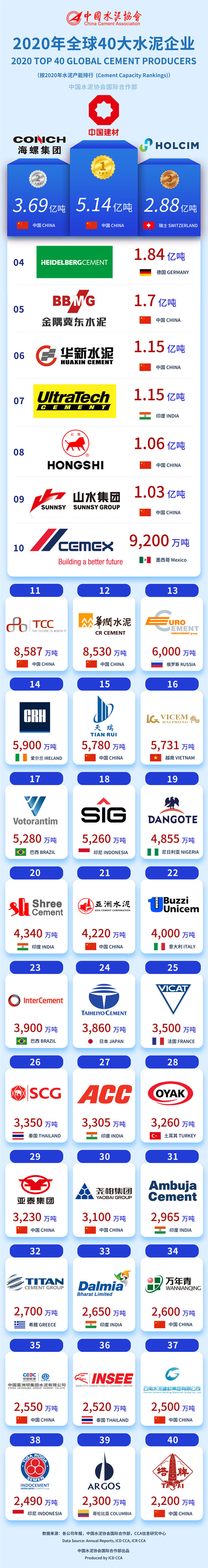 9月18日,中國水泥協(xié)會發(fā)布“2020年全球40大水泥企業(yè)”榜單,該榜單按2020年水泥產(chǎn)能排名,紅獅控股集團(tuán)以1.06億噸水泥產(chǎn)能列全球第八位、中國第五位。