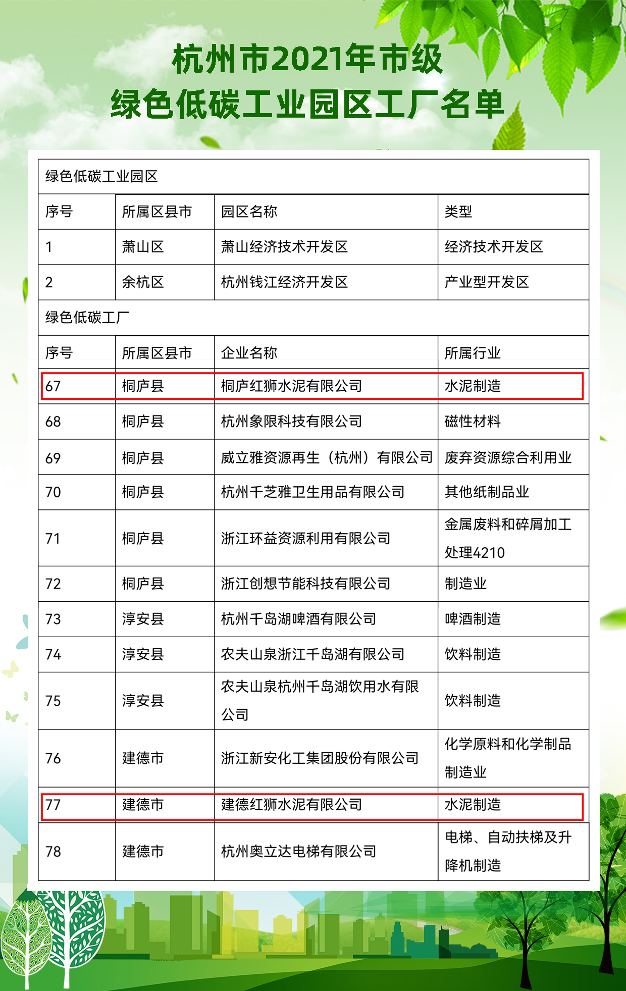 11月23日,杭州市經(jīng)濟和信息化局官網(wǎng)公布“杭州市2021年市級綠色低碳工廠”,紅獅集團旗下的建德紅獅、桐廬紅獅成功登榜。