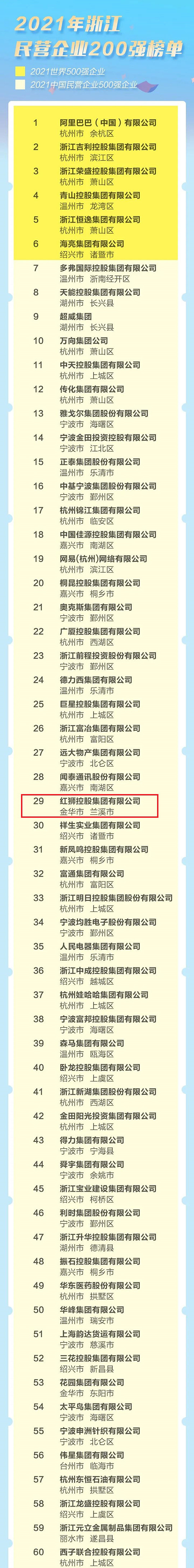 紅獅集團(tuán)列2021浙江民營(yíng)企業(yè)200強(qiáng)第29位