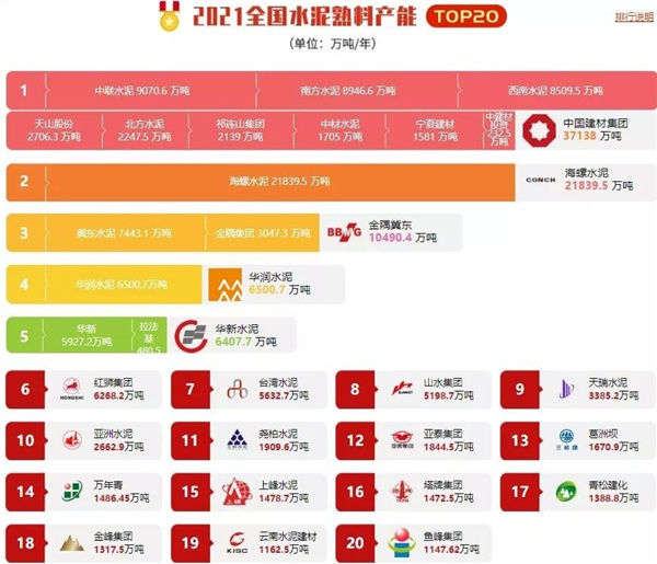 1、此榜單為中國水泥企業(yè)在國內(nèi)和海外的水泥熟料產(chǎn)能總和。