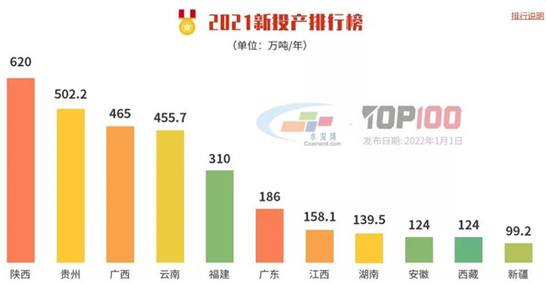 新投產(chǎn)排行榜:全國新投產(chǎn)熟料產(chǎn)能3183.7 陜西 貴州 廣西位列前三甲