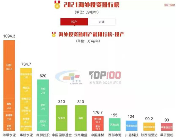 排行說明: 1、此榜單數(shù)據(jù)統(tǒng)計(jì)截至2021年12月31日中國企業(yè)在海外投資并已建成投產(chǎn)、或在建的新型干法熟料生產(chǎn)線產(chǎn)能,不統(tǒng)計(jì)其他窯型及粉磨站產(chǎn)能。2、生產(chǎn)線按設(shè)計(jì)產(chǎn)能計(jì)算:日產(chǎn)能*310天/10000(萬噸/年)。3、合資企業(yè)產(chǎn)能計(jì)入實(shí)際運(yùn)營管理方。4、產(chǎn)能相同時按企業(yè)名稱拼音首字母序排列。5、此排行僅以水泥網(wǎng)收集數(shù)據(jù)統(tǒng)計(jì),如有錯漏之處歡迎指正。