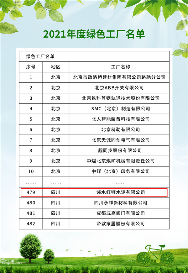 日前,國家工業(yè)和信息化部下發(fā)《關(guān)于公布2021年度綠色制造名單的通知》,鄰水紅獅入選“綠色工廠”名單。