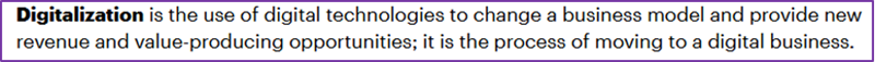 數(shù)字化的概念起源于歐美。1995年,美國麻省理工學院教授尼葛洛龐蒂的《數(shù)字化生存》一書,宣布以“比特”為存在物的數(shù)字化時代的到來。數(shù)字化是指使用0和1兩位數(shù)字編碼來表達和傳輸一切信息的一種綜合性技術(shù),即將電話、電報、數(shù)據(jù)、圖像等各種信息都變成數(shù)字信號。數(shù)字化相關(guān)的英文有Digitization和Digitalization。全球知名IT咨詢公司Gartner對Digitization和Digitalization的解釋分別是: