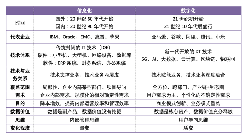 信息化使用的是傳統(tǒng)封閉的IT技術(shù)體系,而數(shù)字化使用的是新興開放的DT技術(shù)體系。IT技術(shù)也就是信息技術(shù),硬件以“IOE”為代表,即IBM的小型機、Oracle的數(shù)據(jù)庫以及EMC的存儲設(shè)備。軟件包括ERP系統(tǒng)、財務(wù)系統(tǒng)、OA辦公系統(tǒng)、CRM客戶管理系統(tǒng)等。DT技術(shù)也就是數(shù)字技術(shù),以5G、AI、大數(shù)據(jù)、云計算、區(qū)塊鏈和物聯(lián)網(wǎng)為代表,是新一代信息技術(shù)。在信息化階段,可以明確區(qū)分出自動化技術(shù)、通訊技術(shù)、信息化技術(shù)等。而數(shù)字化階段,工業(yè)化、自動化、信息化、數(shù)字化、甚至是智能化技術(shù)已經(jīng)融合在一起,很難區(qū)分清楚。信息化考慮的是內(nèi)部資源的優(yōu)化,最終形成一套封閉的技術(shù)體系。而數(shù)字化要實現(xiàn)與供應商、客戶等利益相關(guān)者的數(shù)據(jù)集成,因此構(gòu)建的是開放的技術(shù)體系。2. 技術(shù)與業(yè)務(wù)關(guān)系信息化是技術(shù)支撐業(yè)務(wù)、技術(shù)業(yè)務(wù)兩層皮,而數(shù)字化是技術(shù)賦能業(yè)務(wù)、技術(shù)與業(yè)務(wù)深度融合。信息化是以業(yè)務(wù)流程化、標準化為前提的,用信息技術(shù)將線下的業(yè)務(wù)流程搬到線上,交給信息系統(tǒng)來管理,以提升企業(yè)內(nèi)部的管理效率、運營效率。信息化讓企業(yè)內(nèi)部人員清楚的了解業(yè)務(wù)進展的狀態(tài),從而為業(yè)務(wù)的開展提供支撐。信息化時代業(yè)務(wù)在物理世界開展,信息系統(tǒng)提供支撐。企業(yè)有什么業(yè)務(wù)就建設(shè)什么信息系統(tǒng)。例如我們熟知的OA辦公系統(tǒng)、ERP資源管理系統(tǒng)、CRM客戶管理系統(tǒng)、SCM供應鏈管理系統(tǒng)以及MIS管理信息系統(tǒng)。信息化不改變業(yè)務(wù)本身,還是按照線下的流程去走,只是加快了信息傳遞、流通的速度,從而提升效率、降低成本。數(shù)字化時代讓內(nèi)外所有資源和全業(yè)務(wù)流程,都與技術(shù)產(chǎn)生真正的交互,并對內(nèi)外數(shù)據(jù)的交互做分析和處理,進而改變傳統(tǒng)的商業(yè)運作模式。數(shù)字化是要實現(xiàn)業(yè)務(wù)在數(shù)字世界開展,實現(xiàn)業(yè)務(wù)的數(shù)字化,使得企業(yè)能在一個數(shù)字化的商業(yè)環(huán)境中發(fā)展出新的業(yè)務(wù)、創(chuàng)新商業(yè)模式。也就是說,數(shù)字化會通過數(shù)字技術(shù)改變原有的業(yè)務(wù)流程、經(jīng)營模式,包括研發(fā)模式、生產(chǎn)模式、營銷模式、決策模式等。這是數(shù)字化與信息化最本質(zhì)的區(qū)別。以出租車業(yè)務(wù)為例,傳統(tǒng)的業(yè)務(wù)流程是乘客在路邊招手、出租車司機看到后就過去???,路線通常由司機選擇,這是在物理世界里開展業(yè)務(wù)。出租車背后有司機管理系統(tǒng)、車輛調(diào)控系統(tǒng)等,這是信息化。而數(shù)字化的網(wǎng)約車將傳統(tǒng)的出租車攬客過程搬到了數(shù)字化平臺上,業(yè)務(wù)在數(shù)字世界展開:乘客在App上約車、選擇目的地,司機依附于網(wǎng)約車平臺,發(fā)布自己的行駛軌跡,通過系統(tǒng)算法匹配到合適的乘客,搶單攬客,接到乘客之后系統(tǒng)會自動規(guī)劃好路線、抵達時間和費用。與傳統(tǒng)出租車司機開著車到處尋找乘客不同,這種業(yè)務(wù)模式只能在網(wǎng)約車平臺(數(shù)字化空間)開展,這就是數(shù)字化。信息化不涉及跨部門問題,而數(shù)字化涉及到跨部門數(shù)據(jù)打通乃至跨組織的數(shù)據(jù)融合。信息化是針對局部業(yè)務(wù)進行優(yōu)化,是局部性、項目導向的,主要在單個或多個部門內(nèi)部應用,很少有跨部門的融合,更少有產(chǎn)業(yè)鏈上下游的整合和集成。這樣導致的結(jié)果就是信息系統(tǒng)之間是相互割裂的、獨立的,形成了信息孤島。比如查詢相關(guān)數(shù)據(jù),則需要登錄企業(yè)的不同系統(tǒng),銷售是一套系統(tǒng)、庫存是一套系統(tǒng)、客戶數(shù)據(jù)是一套系統(tǒng),數(shù)據(jù)查詢要花費很多時間。不同信息系統(tǒng)之間沒有交互功能,每個信息系統(tǒng)都有自己的數(shù)據(jù)庫、操作系統(tǒng)、應用軟件和用戶界面,完全是獨立的體系。數(shù)字化則強調(diào)整合所有業(yè)務(wù)流程、覆蓋全域系統(tǒng),需要全方位的設(shè)計藍圖和路線圖。將企業(yè)整個業(yè)務(wù)流程進行數(shù)字化打通,破除部門墻、組織墻,跨部門甚至是跨上下游的系統(tǒng)互通互聯(lián)、數(shù)據(jù)融合,打通整個價值鏈甚至是生態(tài)圈。所以,我們之前說數(shù)字化轉(zhuǎn)型中會遇到數(shù)據(jù)共享問題、需要設(shè)計跨部門的利益分配和激勵機制,其根本原因就在于此。這一現(xiàn)象在信息化建設(shè)中是不存在的,這是數(shù)字化帶來的數(shù)據(jù)治理新挑戰(zhàn)。例如,在美的數(shù)字化1.0階段,最高管理層經(jīng)過對集團自身的調(diào)查研究,發(fā)現(xiàn)企業(yè)大規(guī)模IT系統(tǒng)加起來有100余套,系統(tǒng)、流程、數(shù)據(jù)都是分散的,系統(tǒng)與系統(tǒng)之間數(shù)據(jù)無法拉通,流程不一致,無法實現(xiàn)集團統(tǒng)一管理。于是,美的提出了“632”戰(zhàn)略,目的是實現(xiàn)“一個