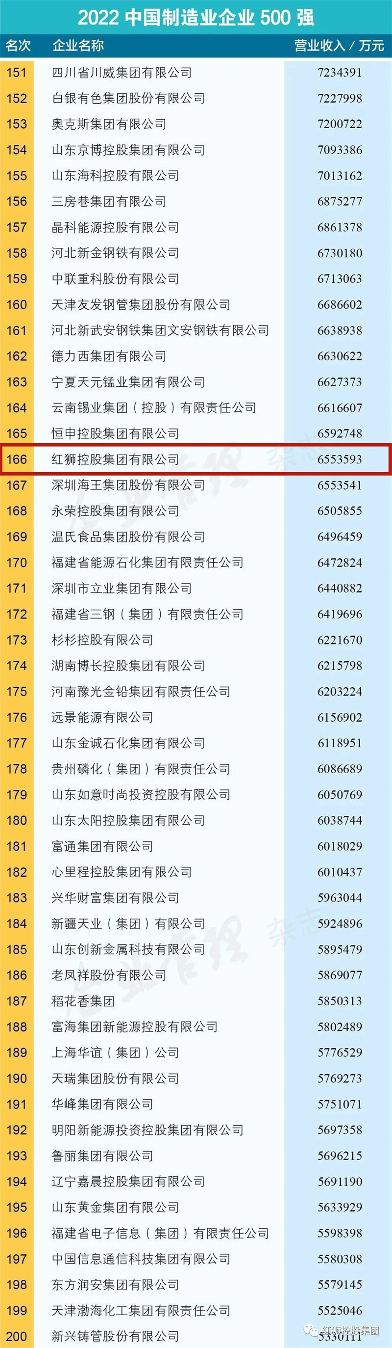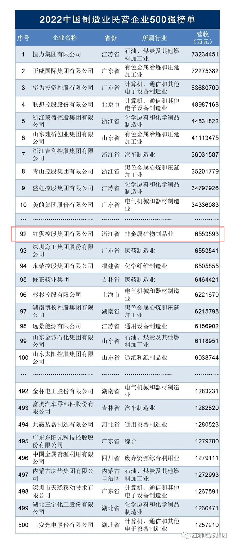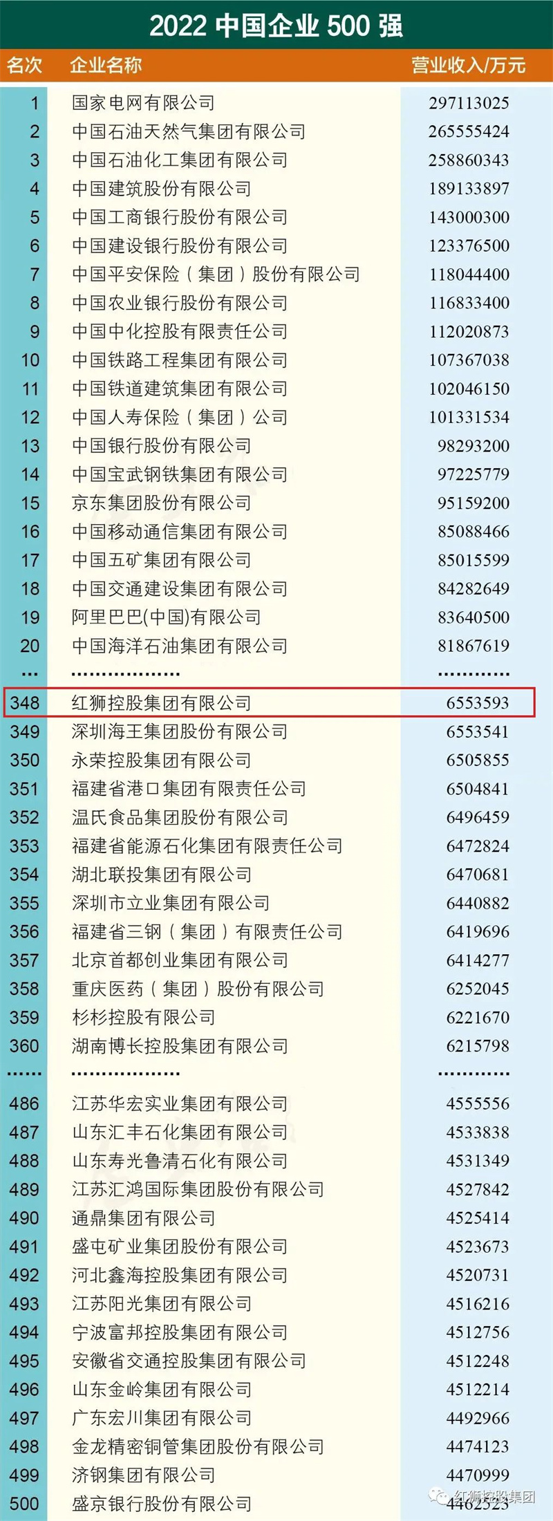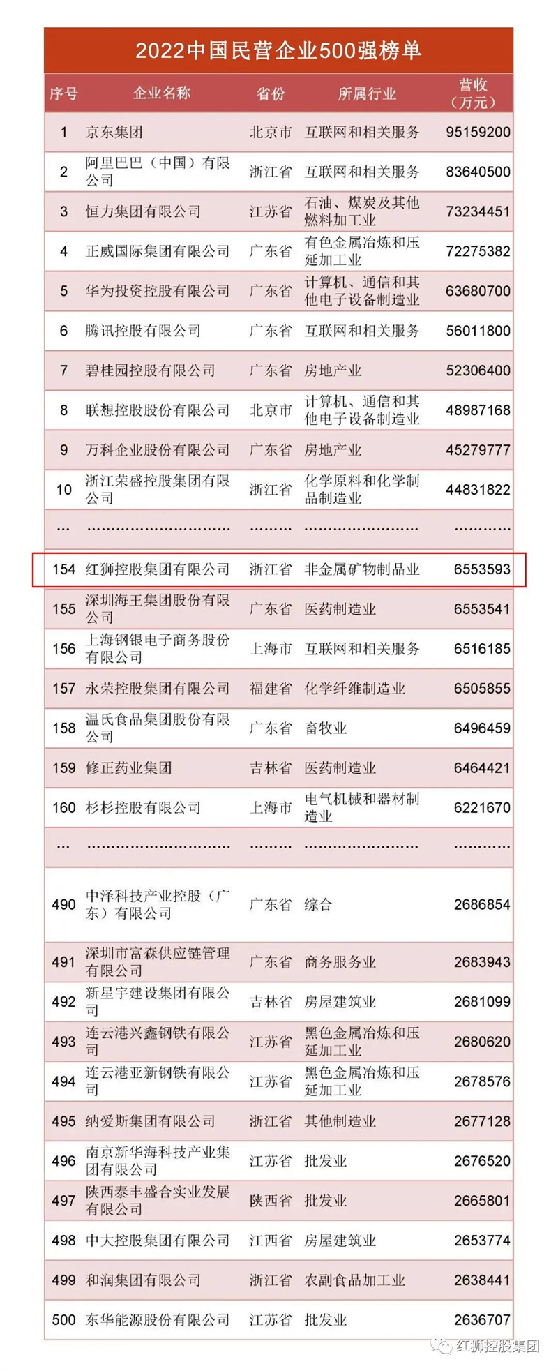 紅獅集團(tuán)位列2022中國(guó)企業(yè)500強(qiáng)第348位、中國(guó)民營(yíng)企業(yè)500強(qiáng)第154位