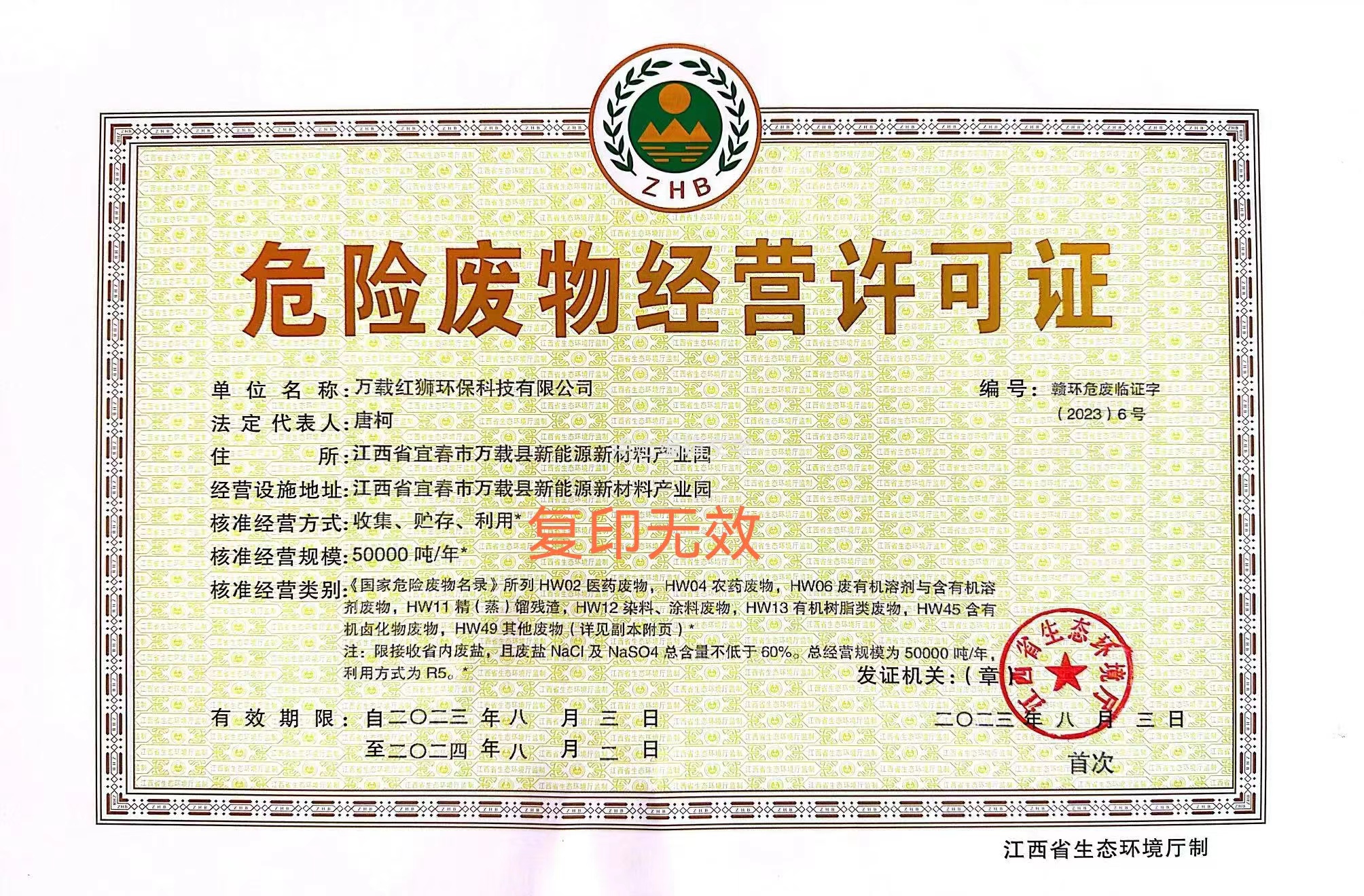 2023年8月4日,萬載紅獅環(huán)保獲批江西省生態(tài)環(huán)境廳核發(fā)的《危廢經(jīng)營許可證》。萬載廢鹽綜合利用項目擁有國內(nèi)首套最大規(guī)模廢鹽資源化處置設(shè)施,是江西省首家廢鹽綜合利用經(jīng)營單位,是集團首個脫離于水泥窯的危廢處置項目,標(biāo)志著紅獅環(huán)保產(chǎn)業(yè)發(fā)展進入新階段、開啟了新篇章。