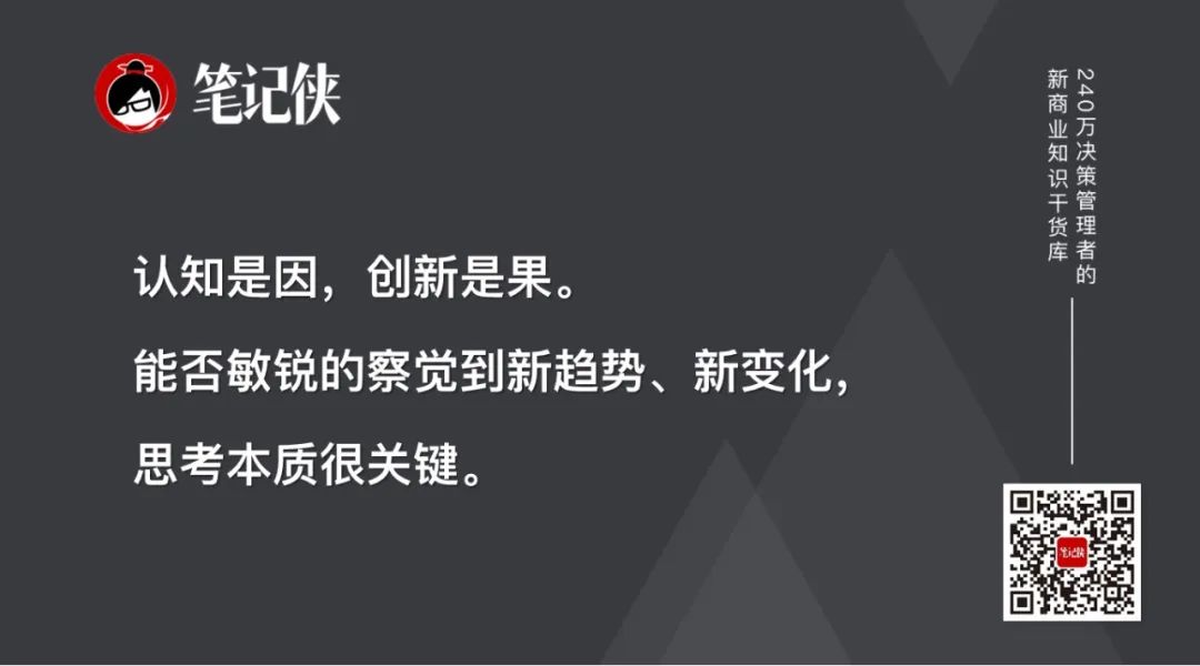 所以,認知是因,創(chuàng)新是果。能否敏銳的察覺到新趨勢、新變化,思考本質很關鍵。想要創(chuàng)新,根本方法是認知升級。