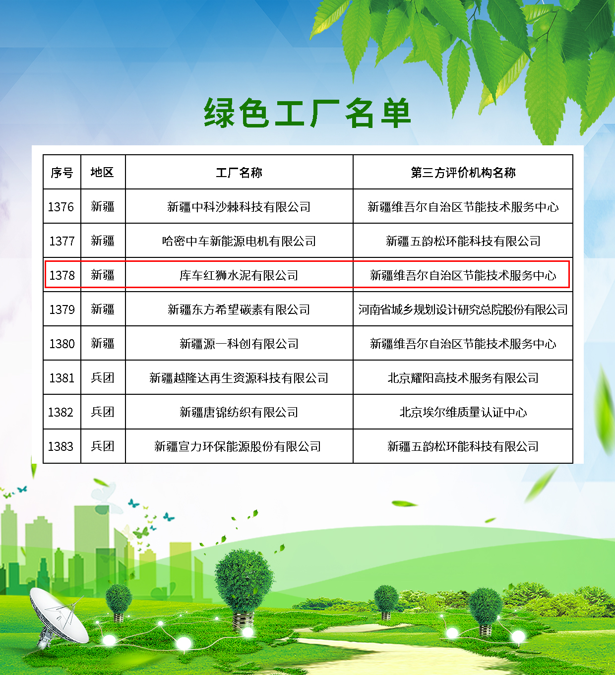 1月5日,工業(yè)和信息化部辦公廳下發(fā)《工信廳節(jié)函〔2023〕384號 工業(yè)和信息化部辦公廳關(guān)于公布2023年度綠色制造名單及試點(diǎn)推行“企業(yè)綠碼”有關(guān)事項(xiàng)的通知》,公布2023年度“國家級綠色工廠"名單,庫車紅獅水泥有限公司上榜。