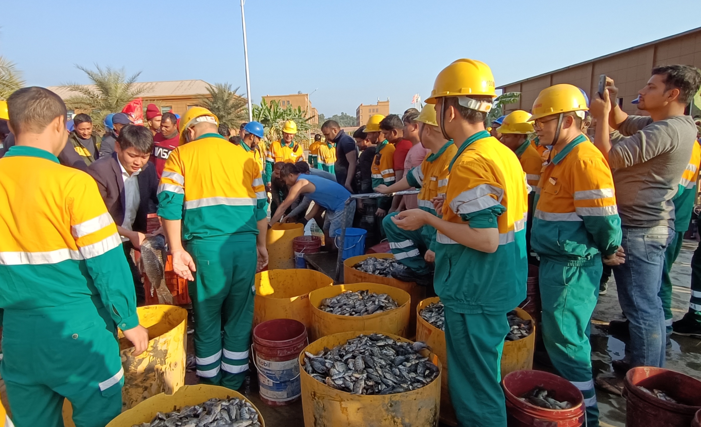 生產(chǎn)線及后勤線各車間、部門員工共組織12支捕魚(yú)隊(duì)伍,每隊(duì)10人。公司提前將廠內(nèi)魚(yú)塘水抽掉多半,所有參賽隊(duì)伍帶著自制的捕魚(yú)工具進(jìn)入魚(yú)塘,待裁判一聲令下,浩浩蕩蕩的百人大軍同時(shí)撲入塘中,與魚(yú)兒們展開(kāi)了一場(chǎng)酣暢淋漓的追逐大戰(zhàn)。